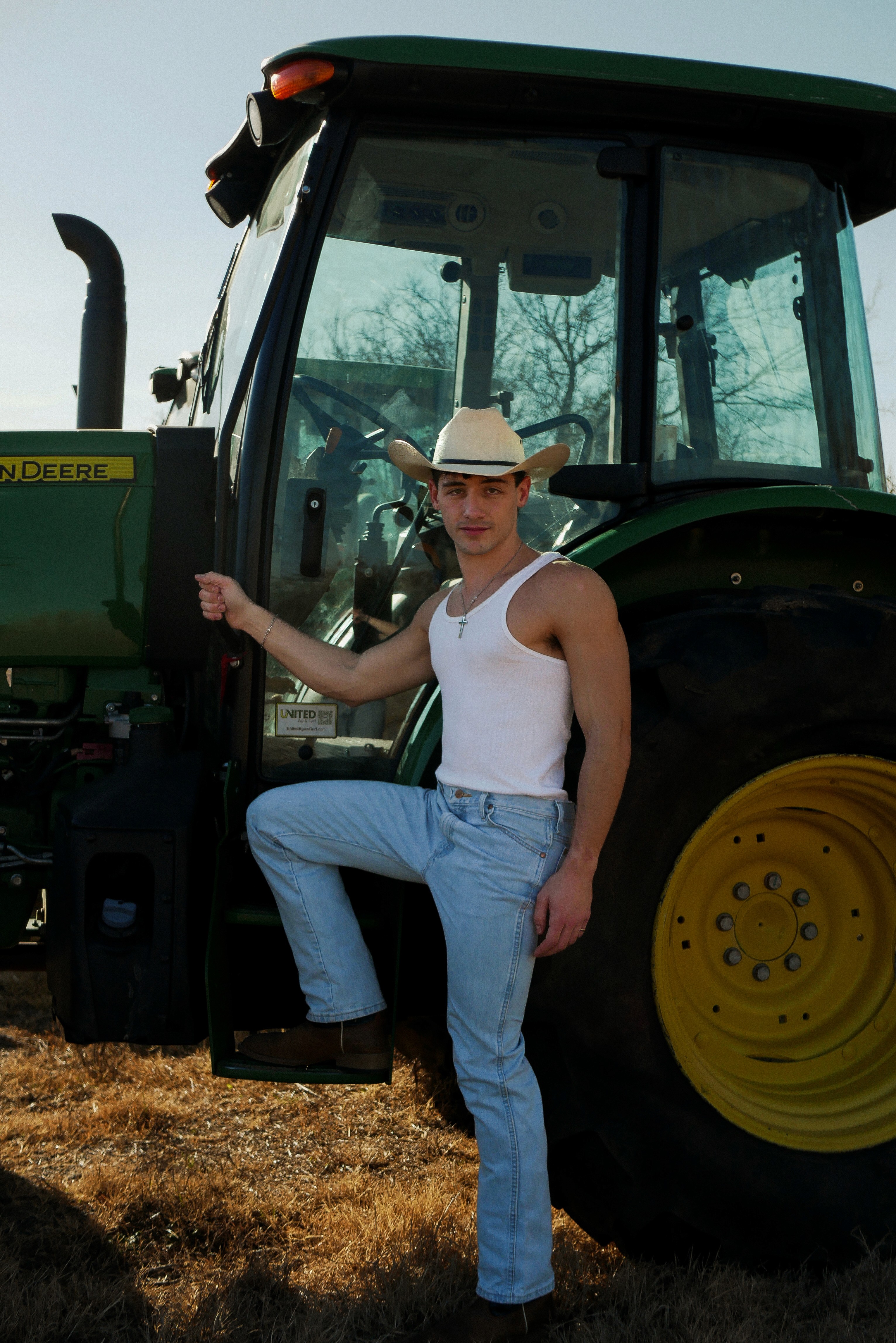 A John Deere inspired portrait shoot blending tractors, cornfields, denim, and raw Americana energy with a cinematic edge.