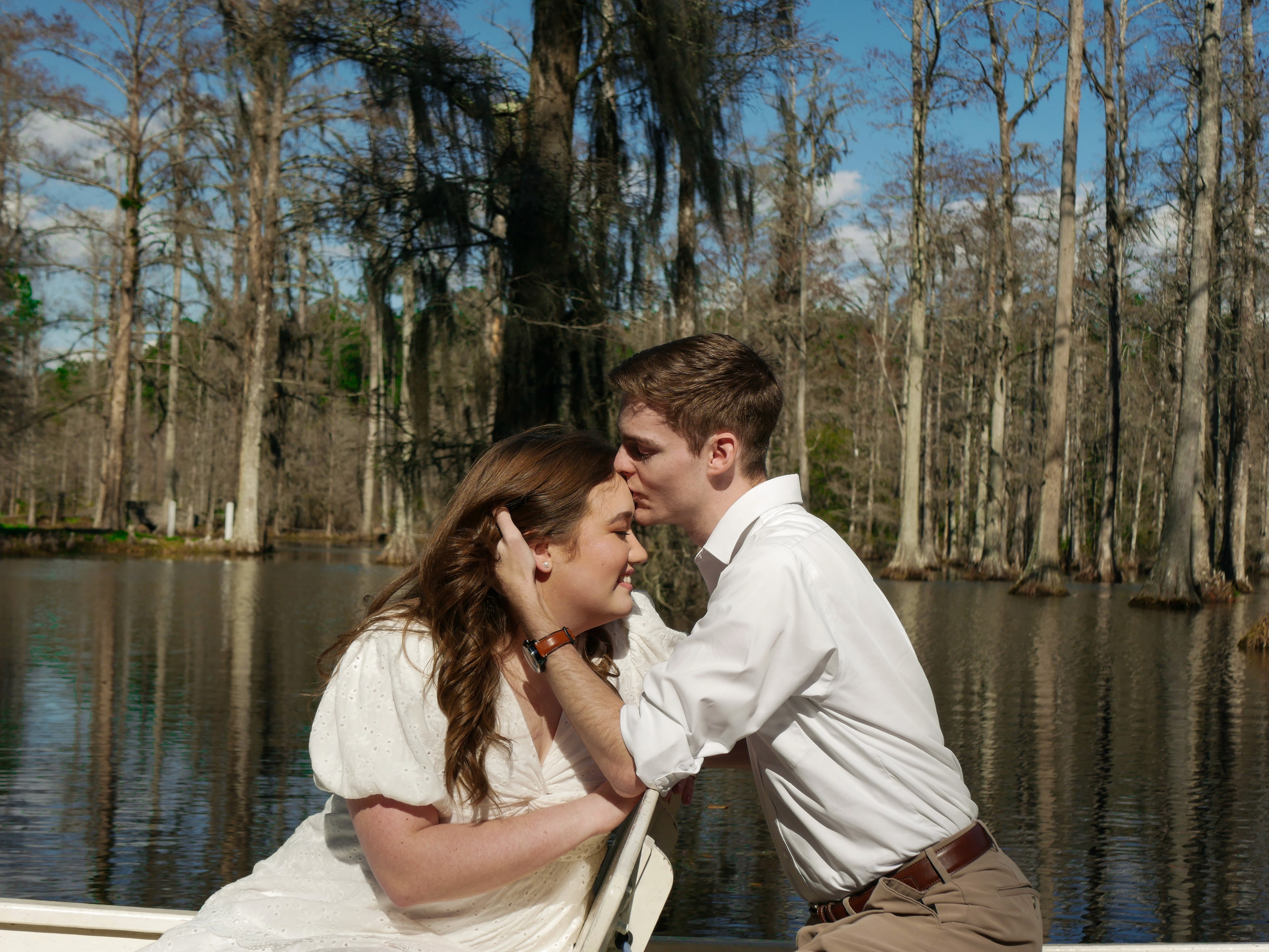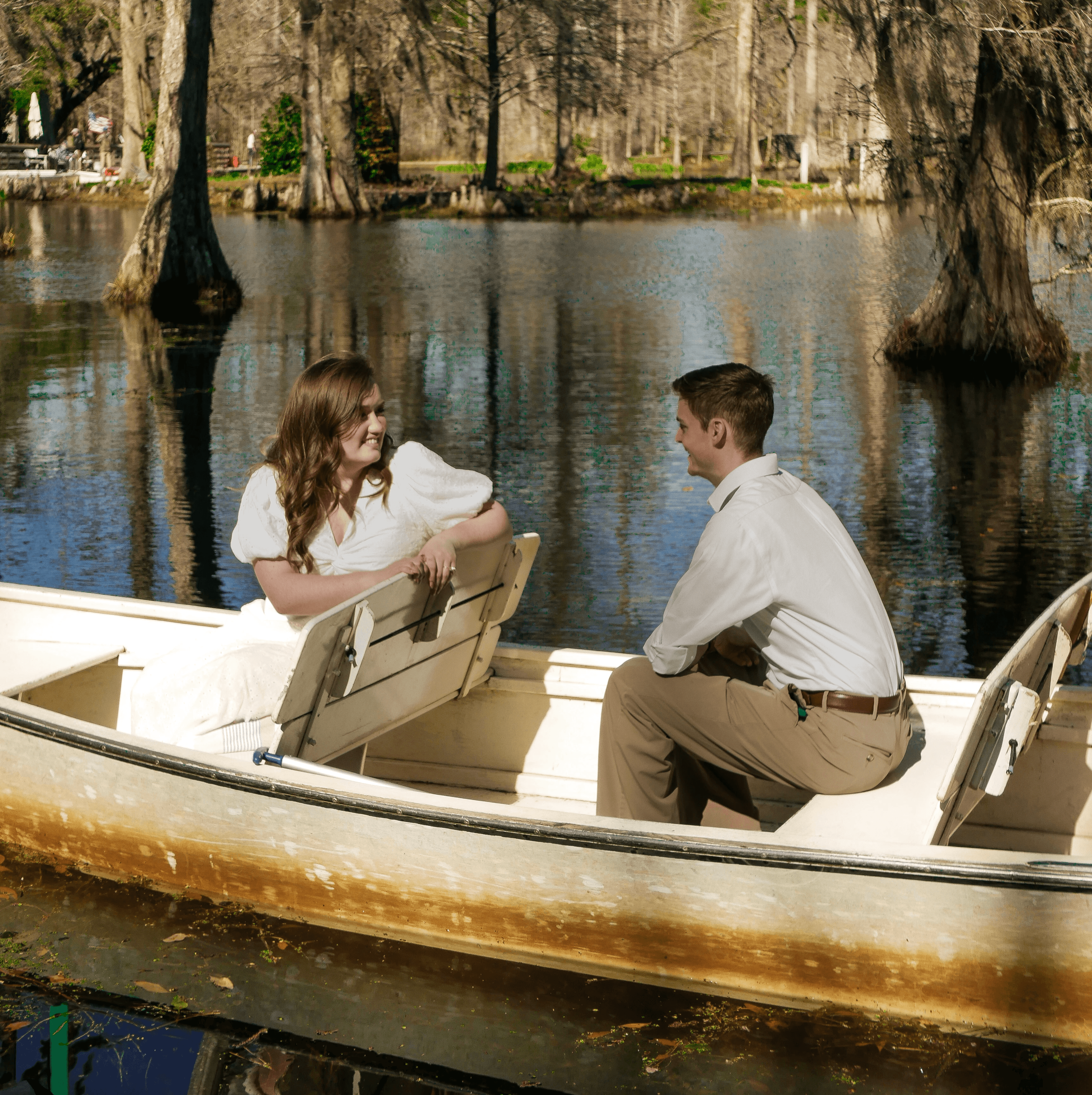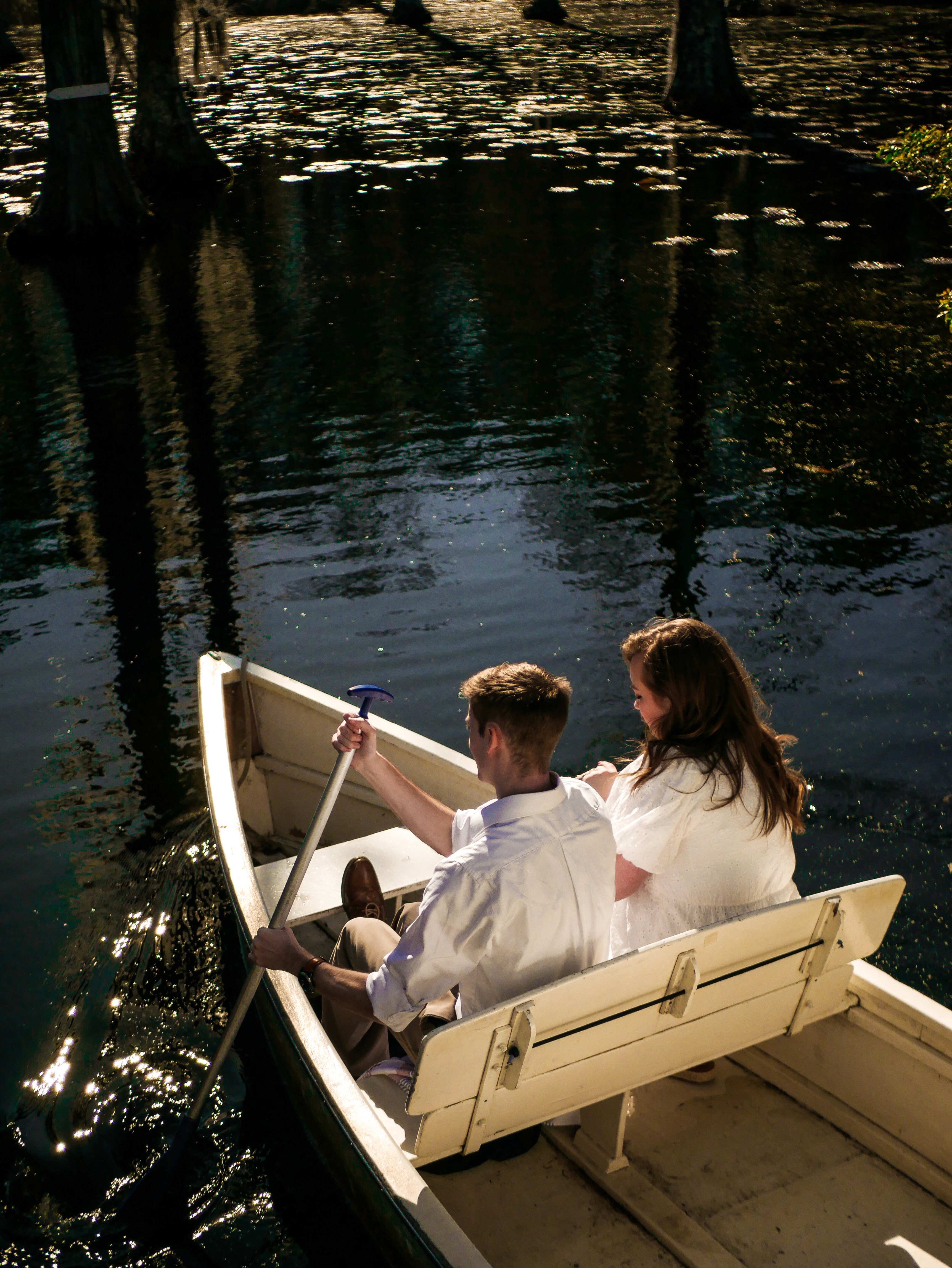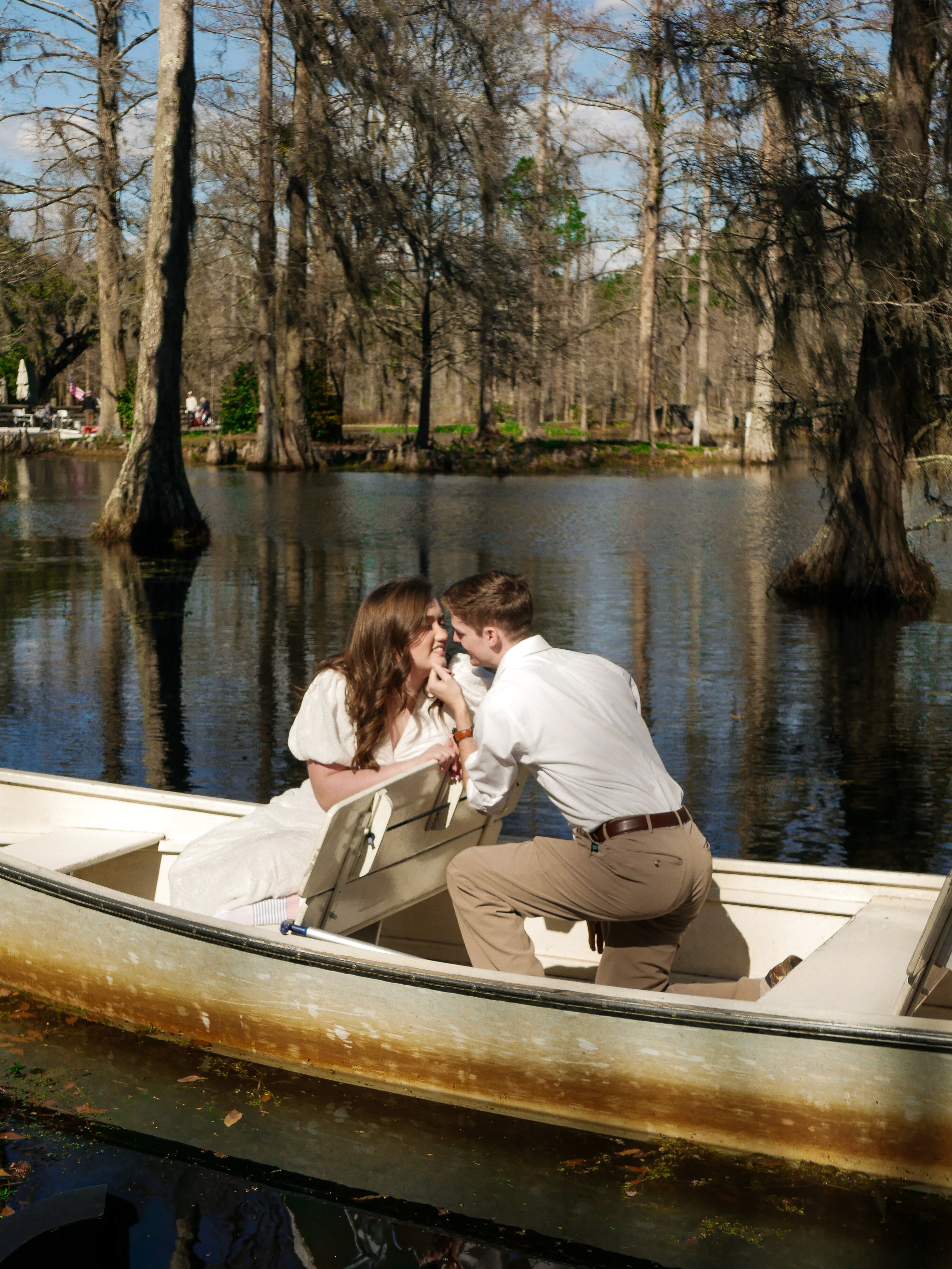A dreamy engagement session at Cypress Gardens inspired by the iconic boat scene, filled with soft light, romantic movement, and fairytale energy.